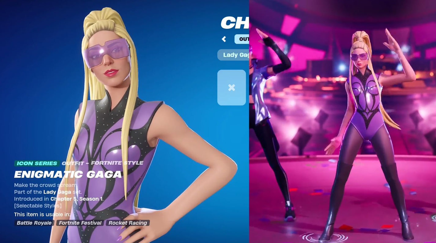 Lady Gaga Skin in Fornite wearing Digital MANTIS Leotard, also known as Enigmatic Gaga