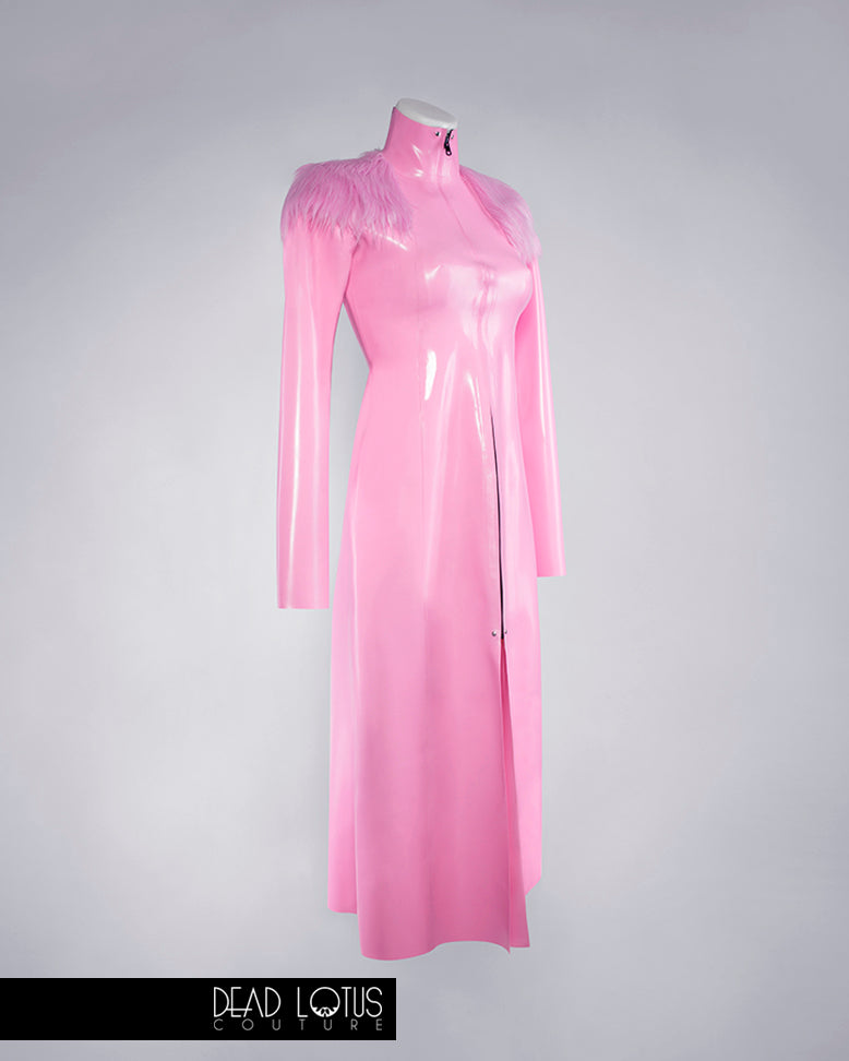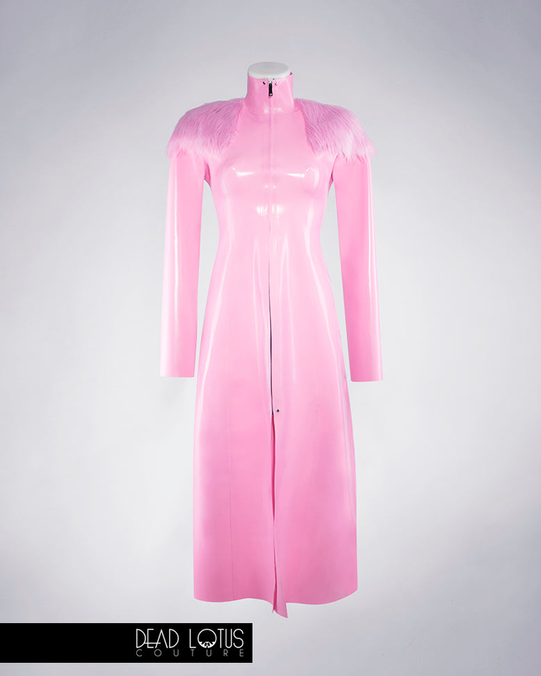 The latex coat's high neck, body shaping structure and long front zipper exude confidence, style and splendour regardless of the weather. It looks and feels so delicious whether open or closed, you might want to wear this latex coat wherever you are, outdoors or in.