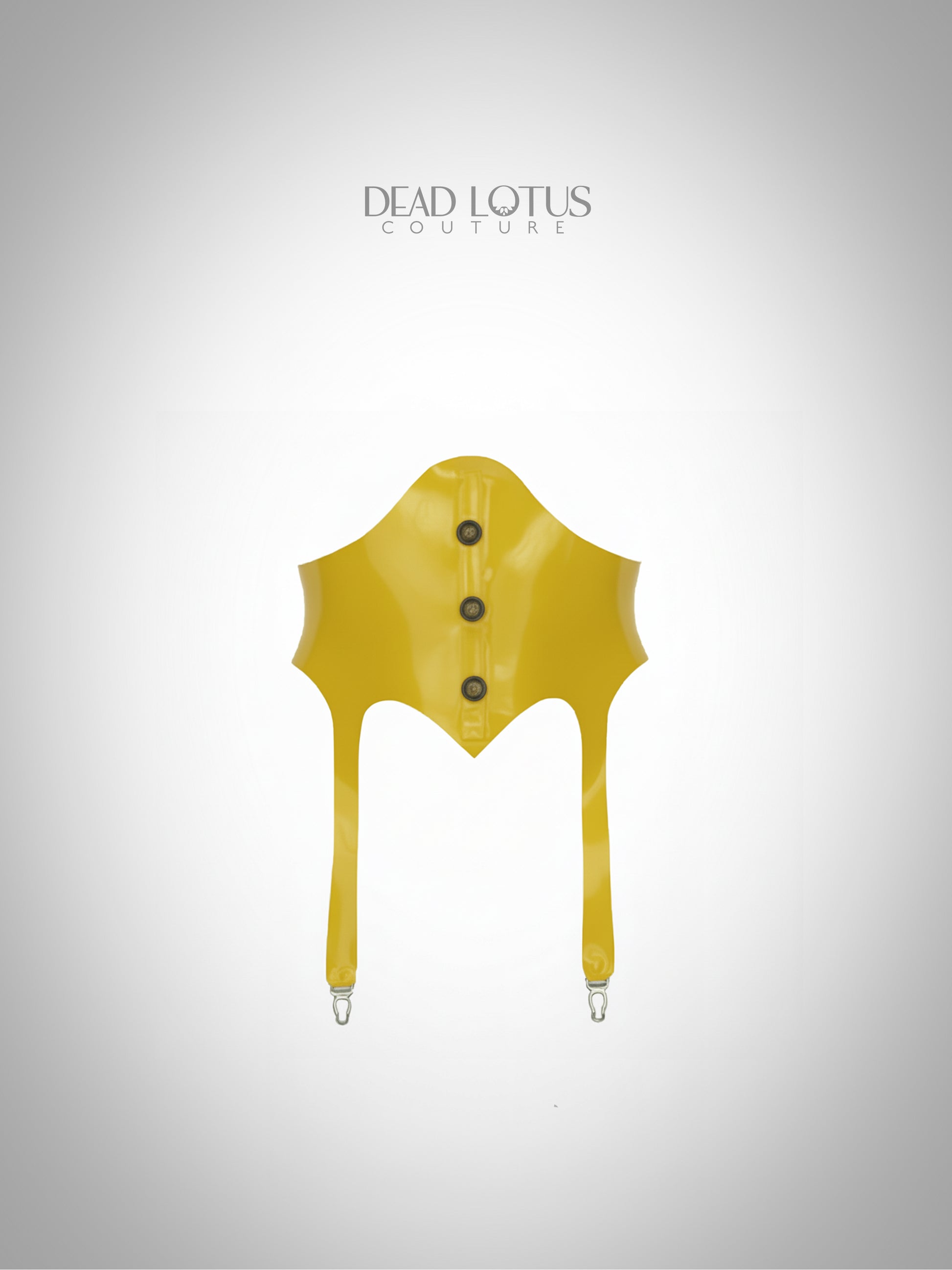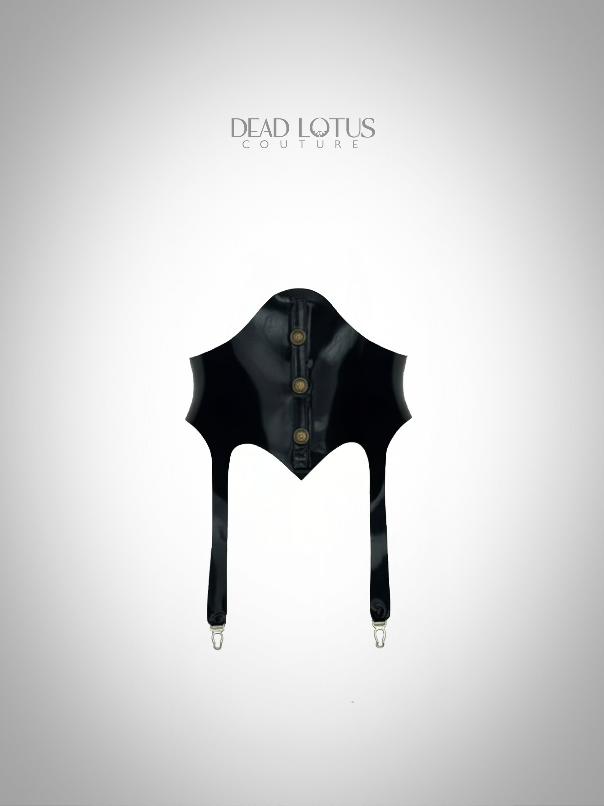 Part corset, part suspender belt, AUSTINA Under-Bust Corset Belt sculpts the waist with sleek latex curves that taper into two elongated garter straps. Flexible light boning hidden inside provides gentle structure and shaping, while three elegant buttons march down the centre front for a crisp, iconic finish. An under-bust arch tightens the front, creating an hour-glass silhouette that feels both armour-like and undeniably sensual. Let the garter tabs swing for a bold, rebellious twist, or for a look as timeless and romantic as an Austen heroine. At the back, snap fasteners make dressing easy and allow subtle size adjustment.