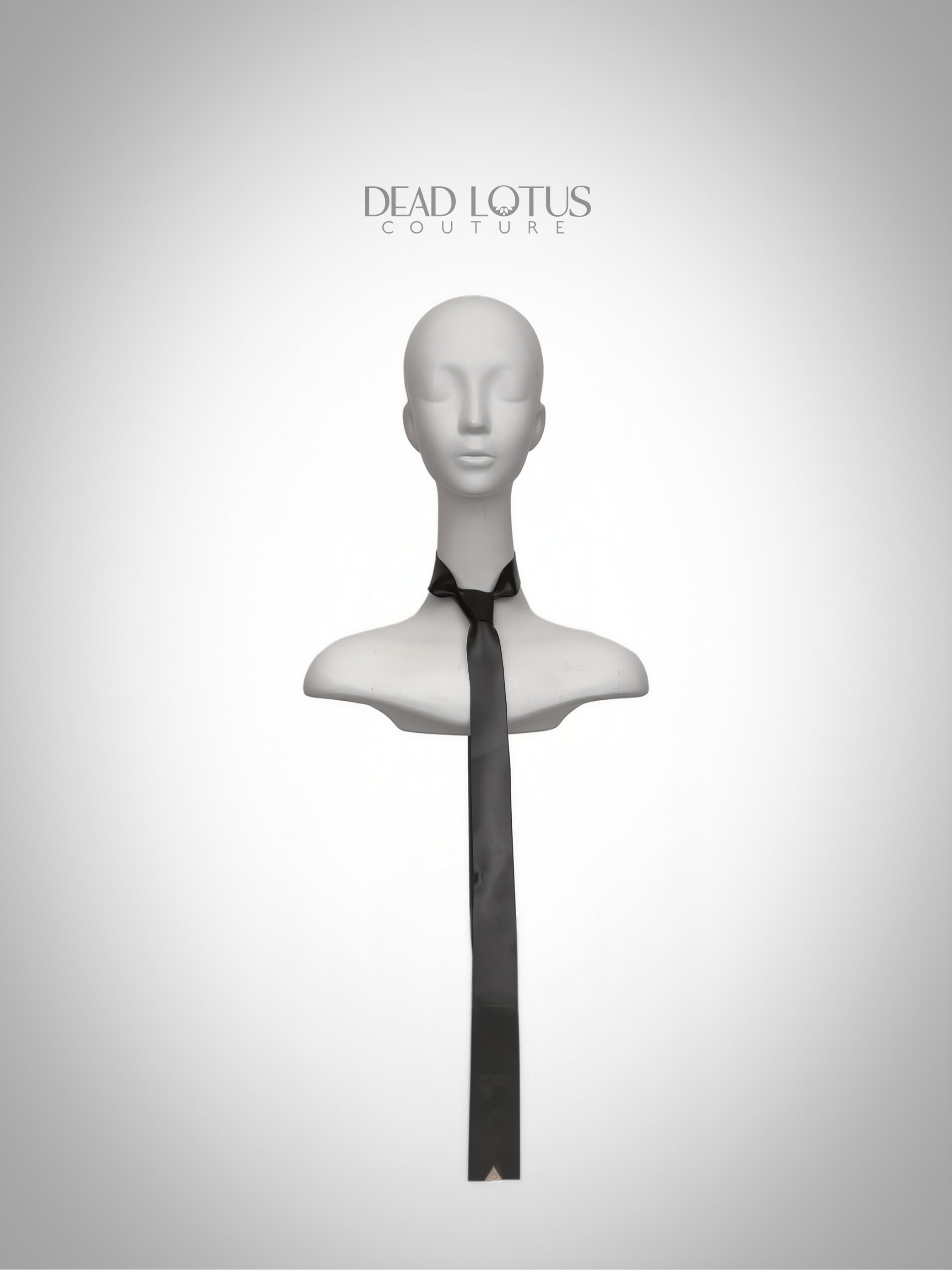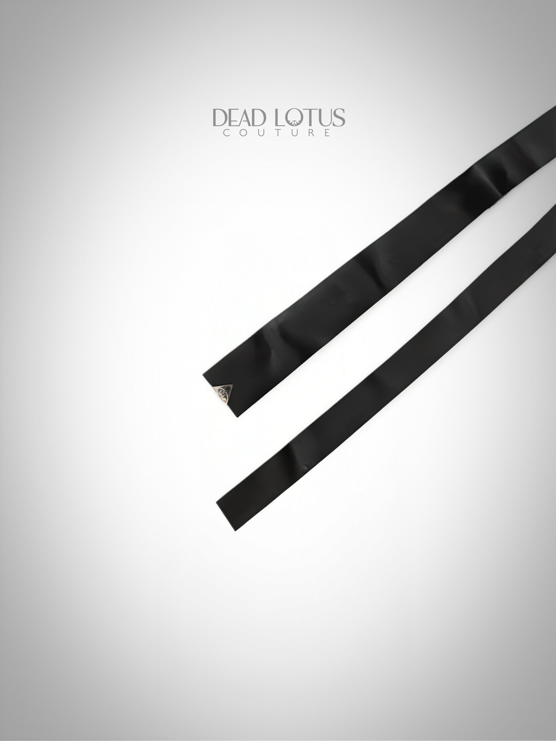 Minimalist yet unapologetically bold, BEAU Square-End Tie slices through convention with a razor-straight, square tip in mirror-gloss latex. The long, uninterrupted line skims the torso, while our signature metal triangular plaque at the end flashes unmistakable Dead Lotus Couture attitude. Pair it with suiting for a clean, surgical edge – or wear it against bare skin for pure, modern provocation.