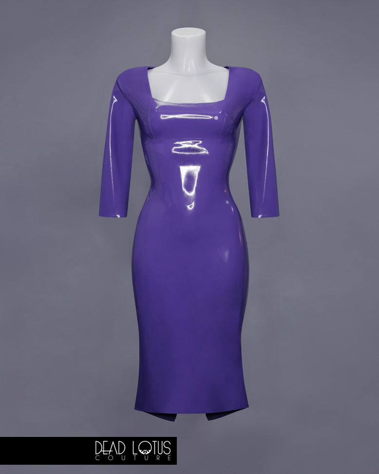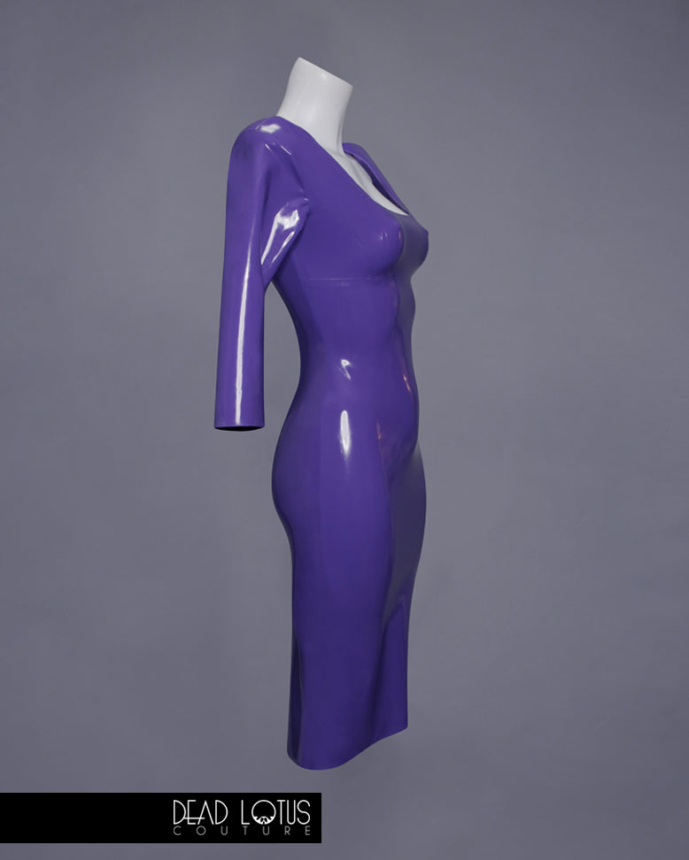 She strolls past them with her slitted midi skirt swooping lower behind her knees. They want to reach out as she walks past but they fear the touch from her slender arms, dressed in ¾-length sleeves, might be more dangerous than war itself. FATALE Dress is made from the best quality natural latex.