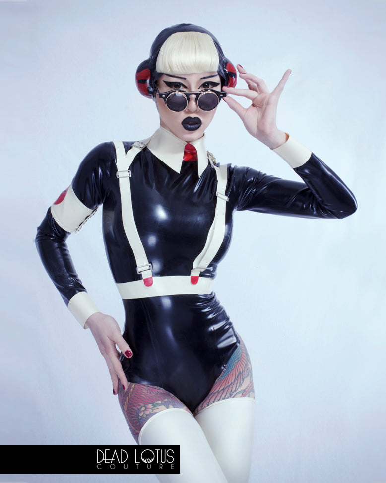 KOTODAMA Leotard is a latex leotard with a contrasting collar, inspired by Edwardian elegance, as well as long sleeves with contrasting cuffs.