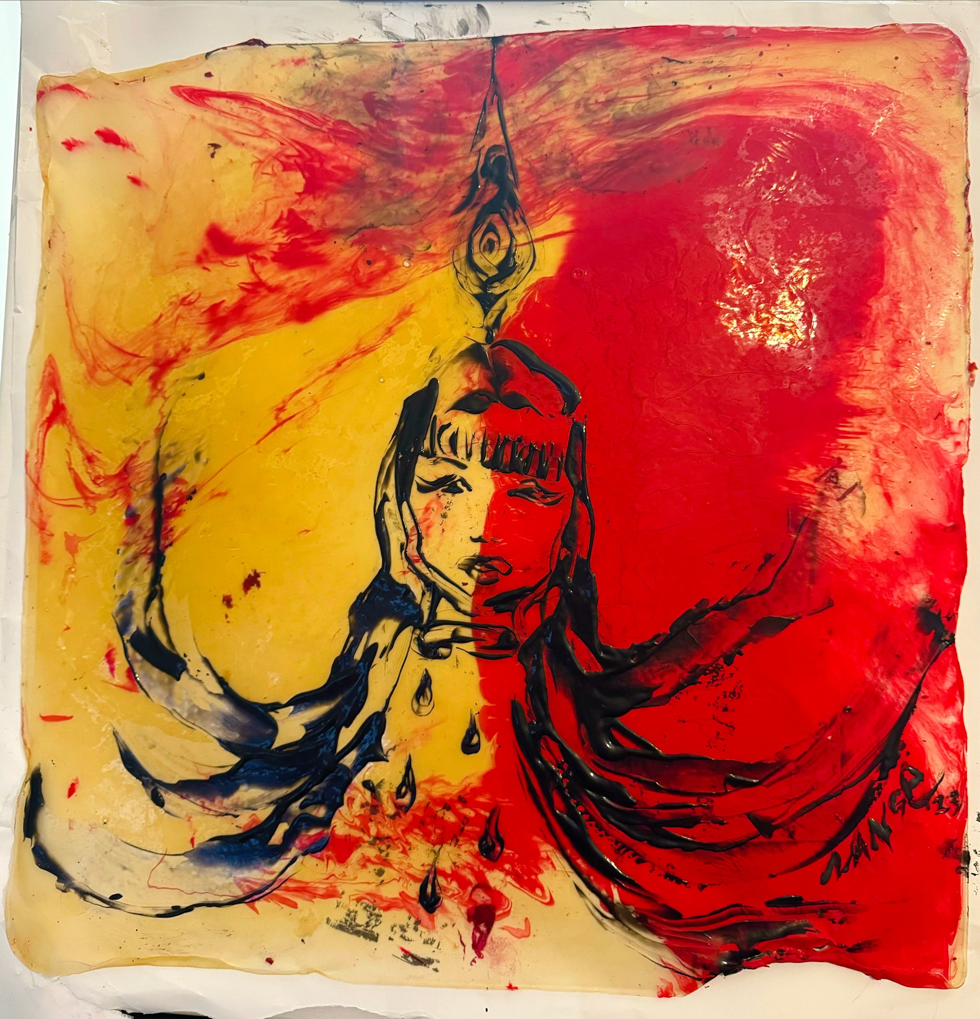 In an effort to turn her inner turmoil into art, Nange turned to a reinterpretation of a classic latex marbling technique recalling Japanese calligraphy. Drawing inspiration from her personal fascination for horror, Nange created a latex "canvas" reminiscent of blood splashed across antique paper. Shapes reminiscent of Koi fish emerge enigmatically from the latex, recalling opulent Japanese screens.