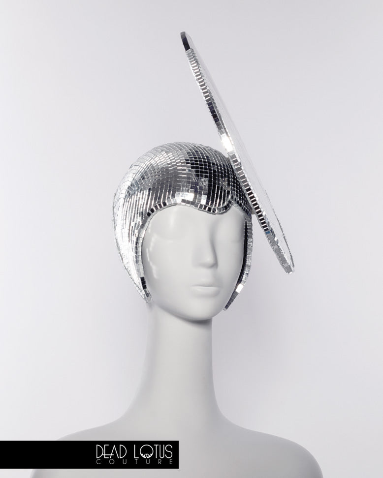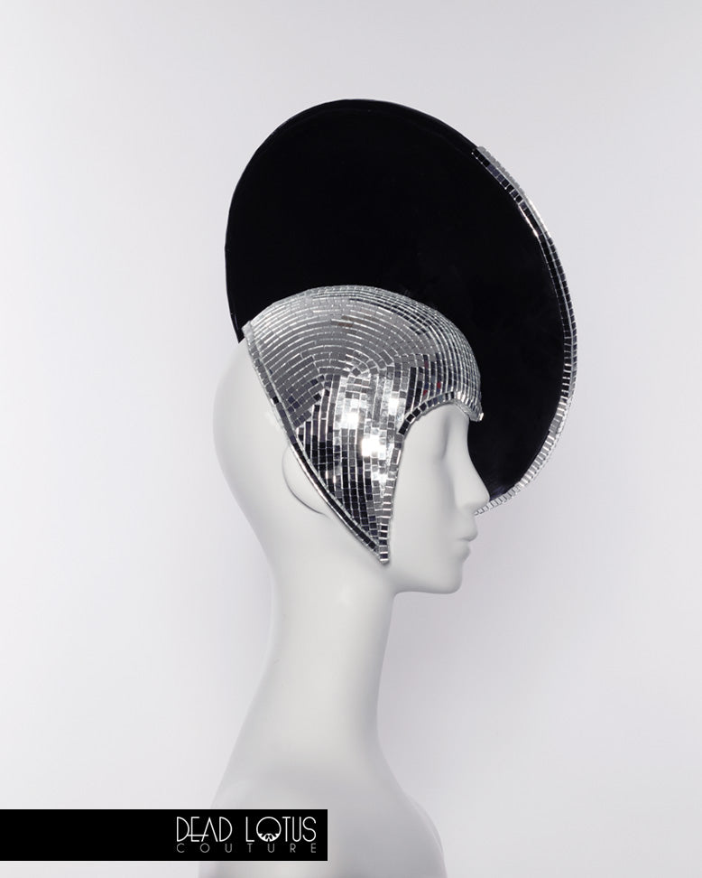 Illicit is a striking, avant garde headpiece, lovingly handmade from the finest materials. Thousands of real glass mirrored tiles catch the light with every move you make, casting reflections that dance like Grace Jones at Studio 54. Offset by bold, irreverent latex detailing, this handcrafted, asymmetrical creation is sure to put you in the spotlight.