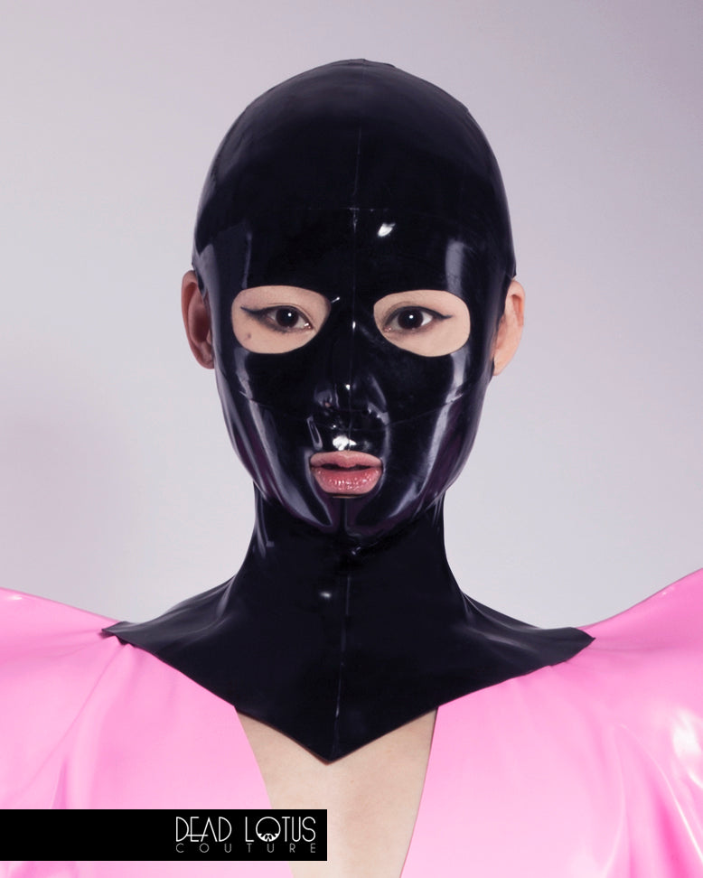 Holes for eyes, nose and mouth let you do the things that a playful second face should, and the latex hood comes with a geometrically shaped neck corset.