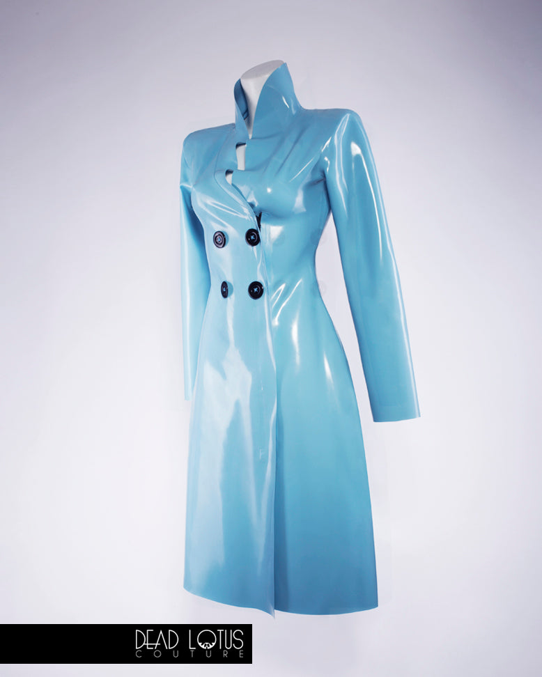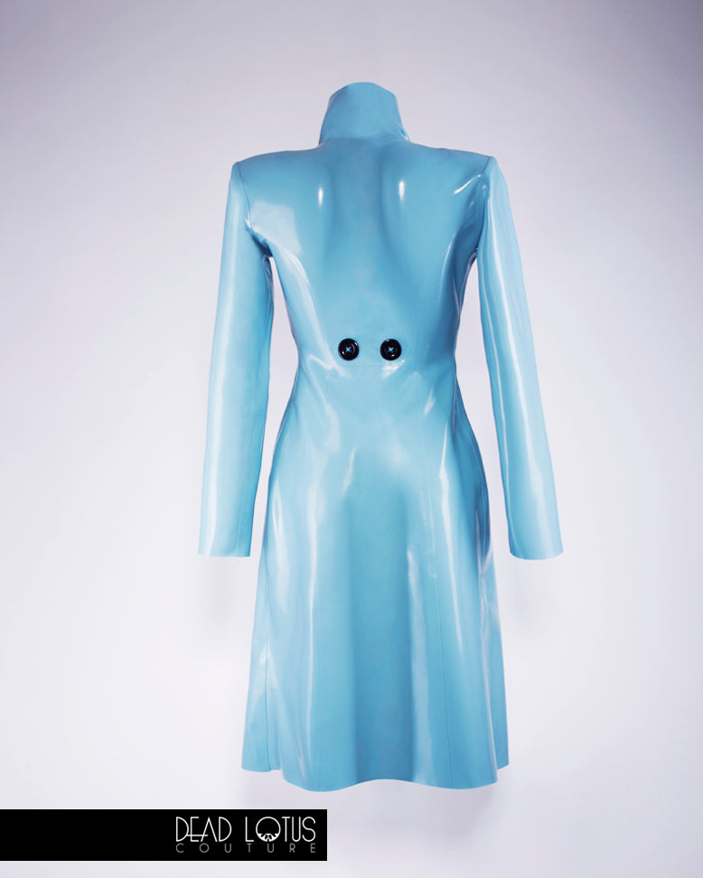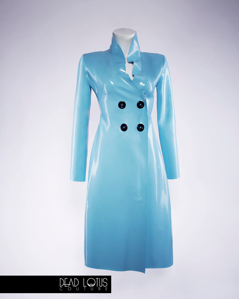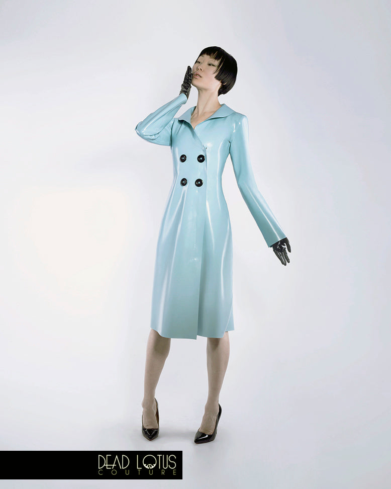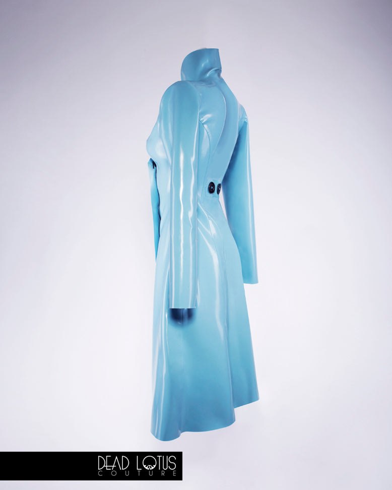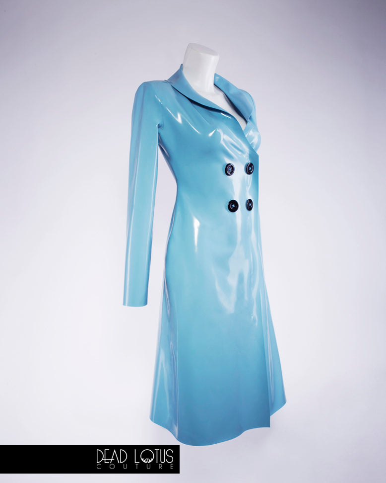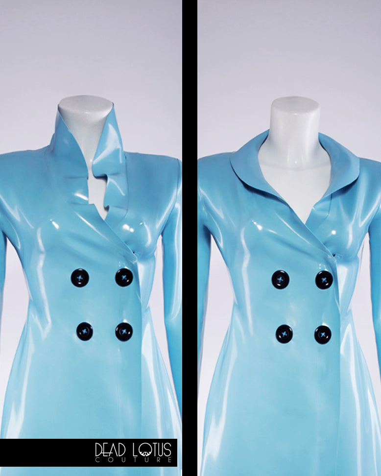 Its oversize high collar can be worn up or down for a more traditional look. The gracious A-line waist, oversize decorative buttons on the front and back, and the knee-length drop prove PLUVIA Latex Classic Trench Coat's classic credentials. Yet with its high quality, thick latex and an off-centre zipper, this coat not only repels the rain, it gives the timeless style a modern sexy yet elegant makeover.