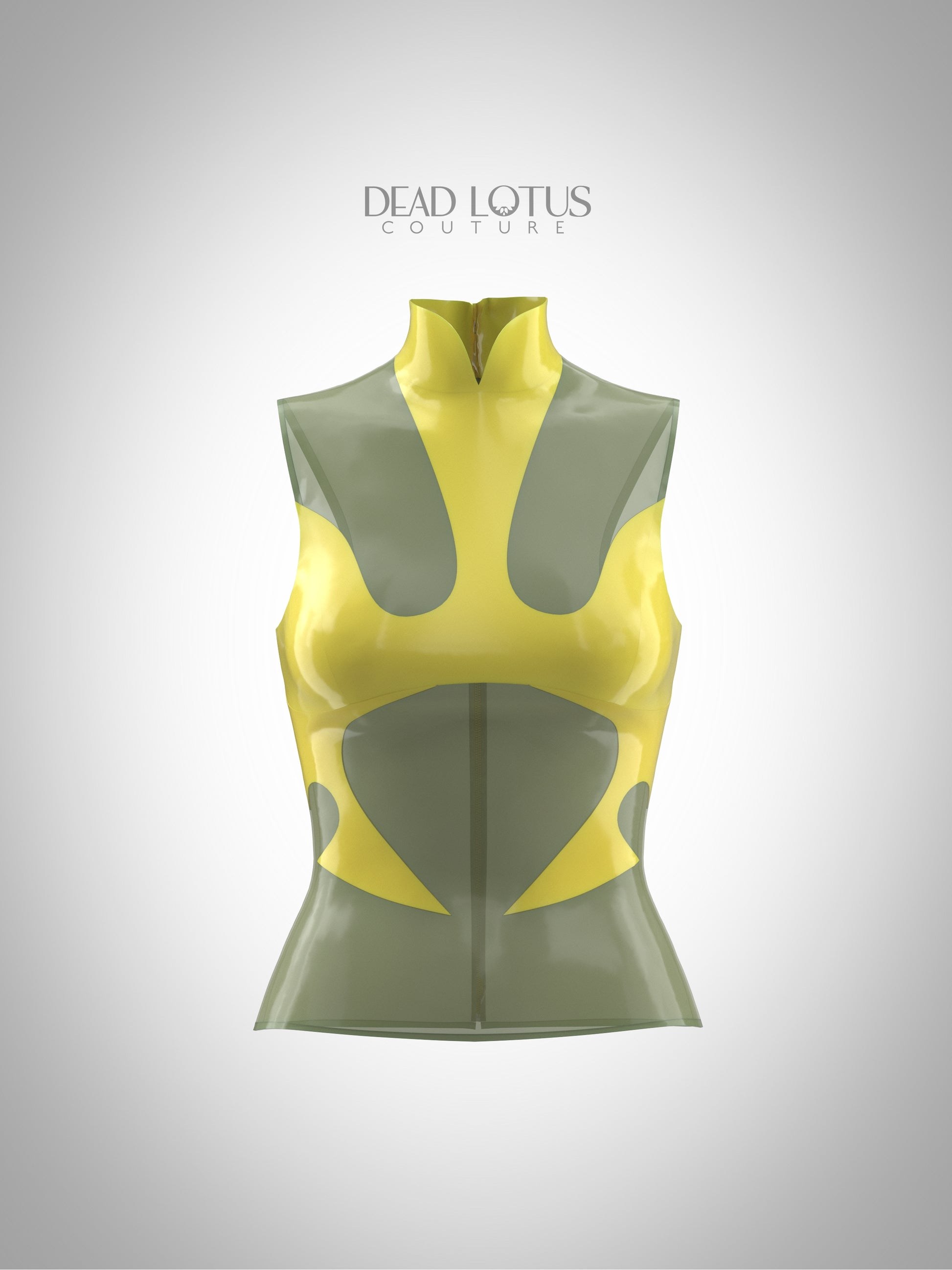 Inspired by classic tattoo art, and 90s rave and techno, WASPANA Top is adorned with futuristic insectoid motifs. WASPANA Top comes with a high collar in luscious extra thick latex and a back zip for easy wear.
